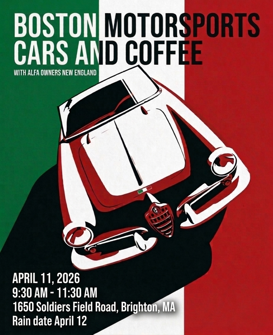 BOSTON MOTORSPORTS ALFA ROMEO in Brighton/Boston has again invited our club to a Cars & Coffee event at their location on April 11th (rain date April 12th) starting at 9:30am. Come hang out with your Alfa friends and take a look at what Boston Motorsports has to offer. We’ll be given a tour of their facility, and can check out the various Giulia, Stelvio, and Tonale models they have around. The showroom also usually has a large number of "ultra" cars (e.g., Ferrari, Lambo, McLaren, BMW comp, Porsche, etc.) that we can ogle.