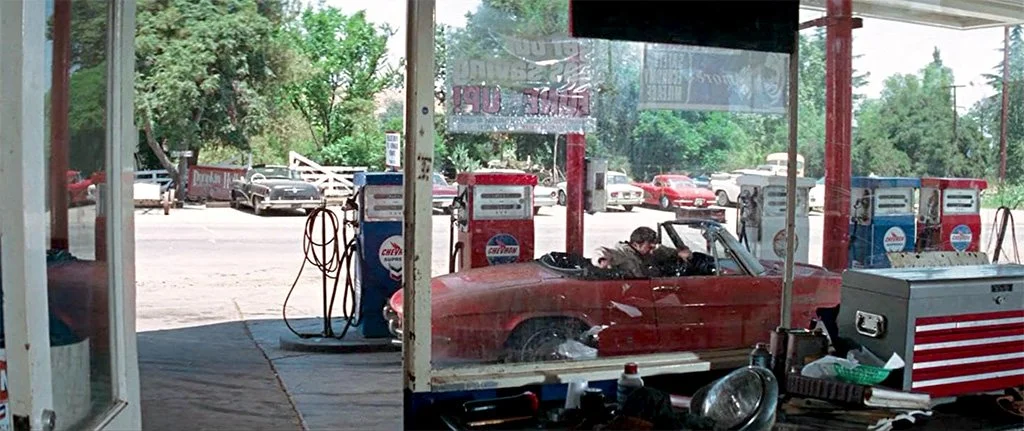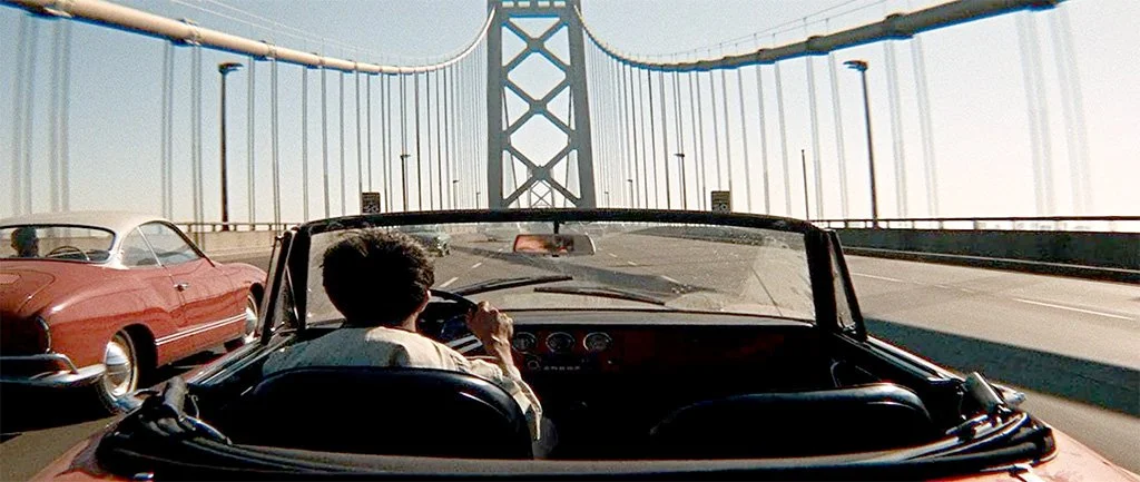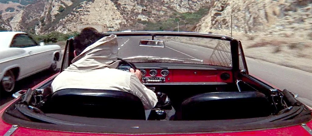 The cars were provided and the filming commenced, but some time passed and Mario was getting concerned about when he would get his cars back. After a few calls and more time had passed, Mario’s secretary came into his office one day and said, “Mr. Silvi, the three cars have just been delivered but you might want to come out and take a look at them.” One of the cars was returned in new condition (the one seen from outside of the car in the movie) but the other two were modified to be used as camera cars! One of the modified cars had a camera mounted on the trunk for a view out the windshield looking over Dustin’s shoulder. The other had a camera mounted on the front looking back through the windshield at Dustin’s face. One of these had a lot of holes drilled in the car for mounting brackets, and the other had a lot of its sheet metal cut out (I think he said that the entire nose was cut off the car)! Movie cameras were much bigger and heavier back in the 1960s.